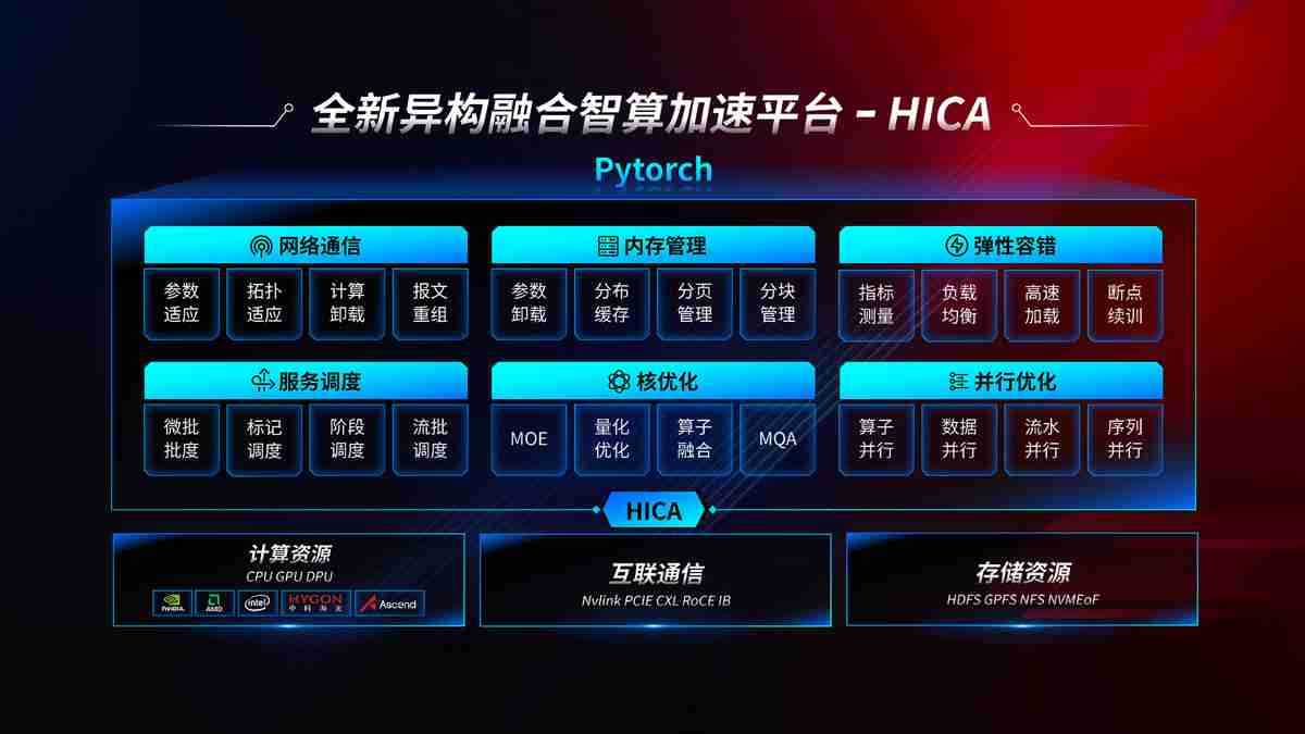 通过自研的服务层、、、、中间适配层、、、、以及调度编排算法,,采用数据并行、、模型并行等多种并行方式,,把并行计算任务进行有效的分解,,,使其分别由相应的软件栈和算力资源来承接。。当GPU资源变化,,,,HICA可以实时动态调度计算子任务并调整模型拓扑和架构,,,以充分聚合各种算力资源。。。